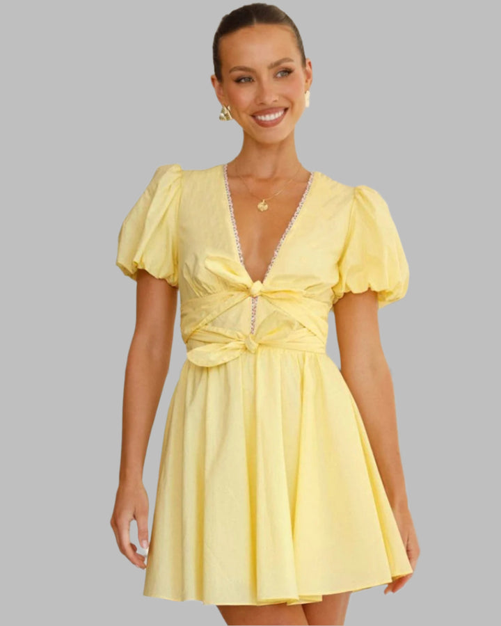 Elegant Lace Puff Sleeve V-Neck Dress with Ribbon Detail